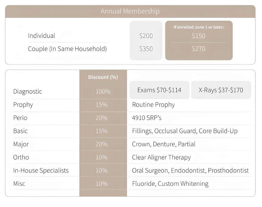For our patients who do not have a traditional dental insurance plan, we offer an in-office dental savings membership. We want all of our patients to have access to affordable, quality dental care regardless if they have dental insurance, which is why the Smiles For Miles VIP membership was created. Smiles For Miles VIP allows patients to have all their exams and necessary radiographs while offering discounts on all other services. See the chart below for a breakdown of fees and please call us if you have any questions regarding the membership.Â